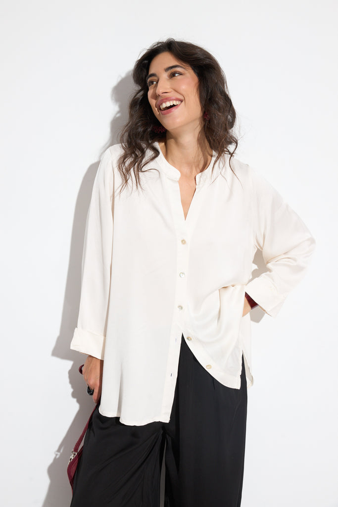 Esta blusa blanca abotonada de cuello maho es una prenda imprescindible para tu fondo de armrario de cualquier época del año. Un básico de manga larga con dobladillo en el puño de la manga y el bajo redondeado. Pequeños detalles sencillos que aportan elegancia para cualquier ocasión.