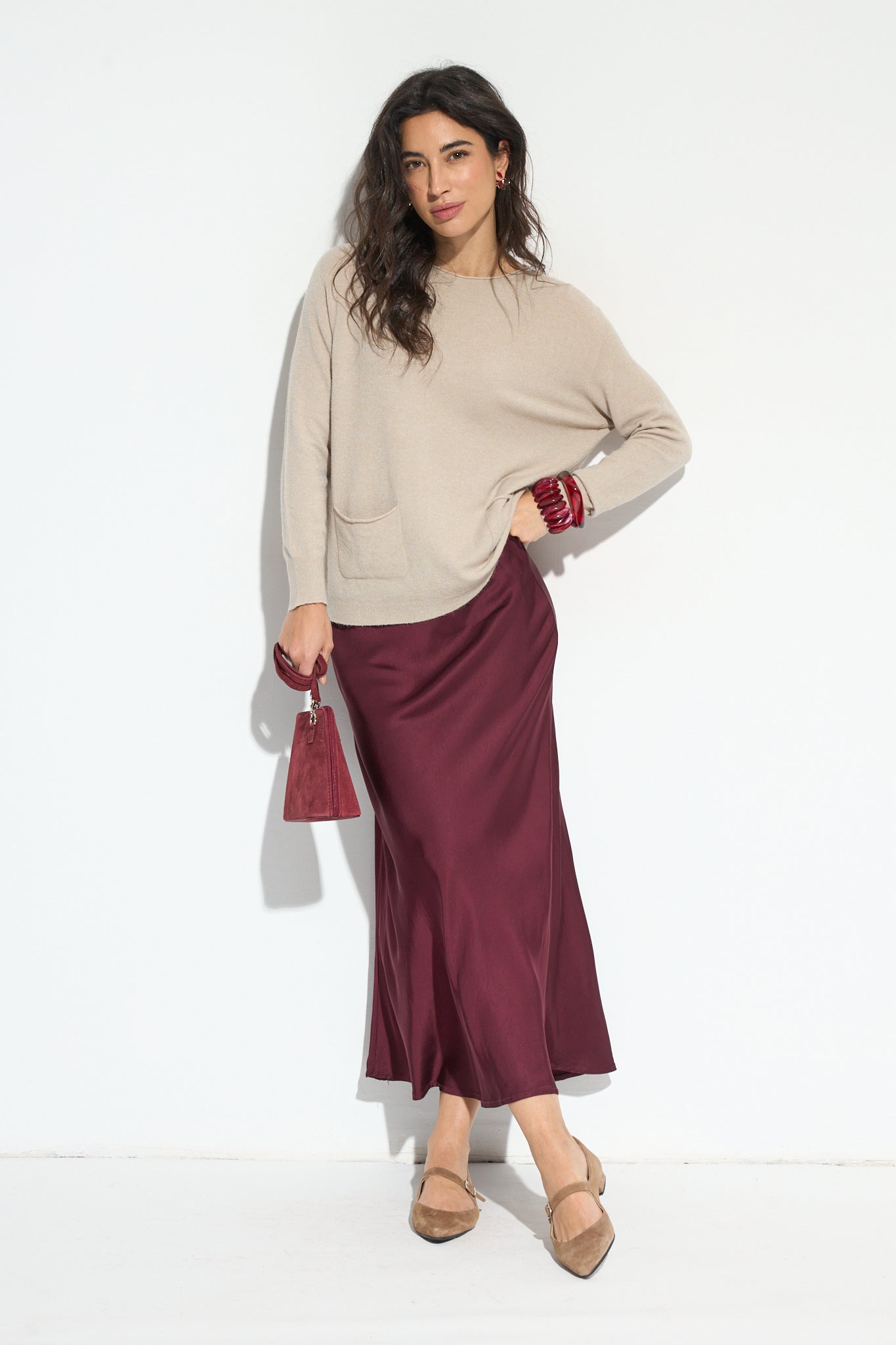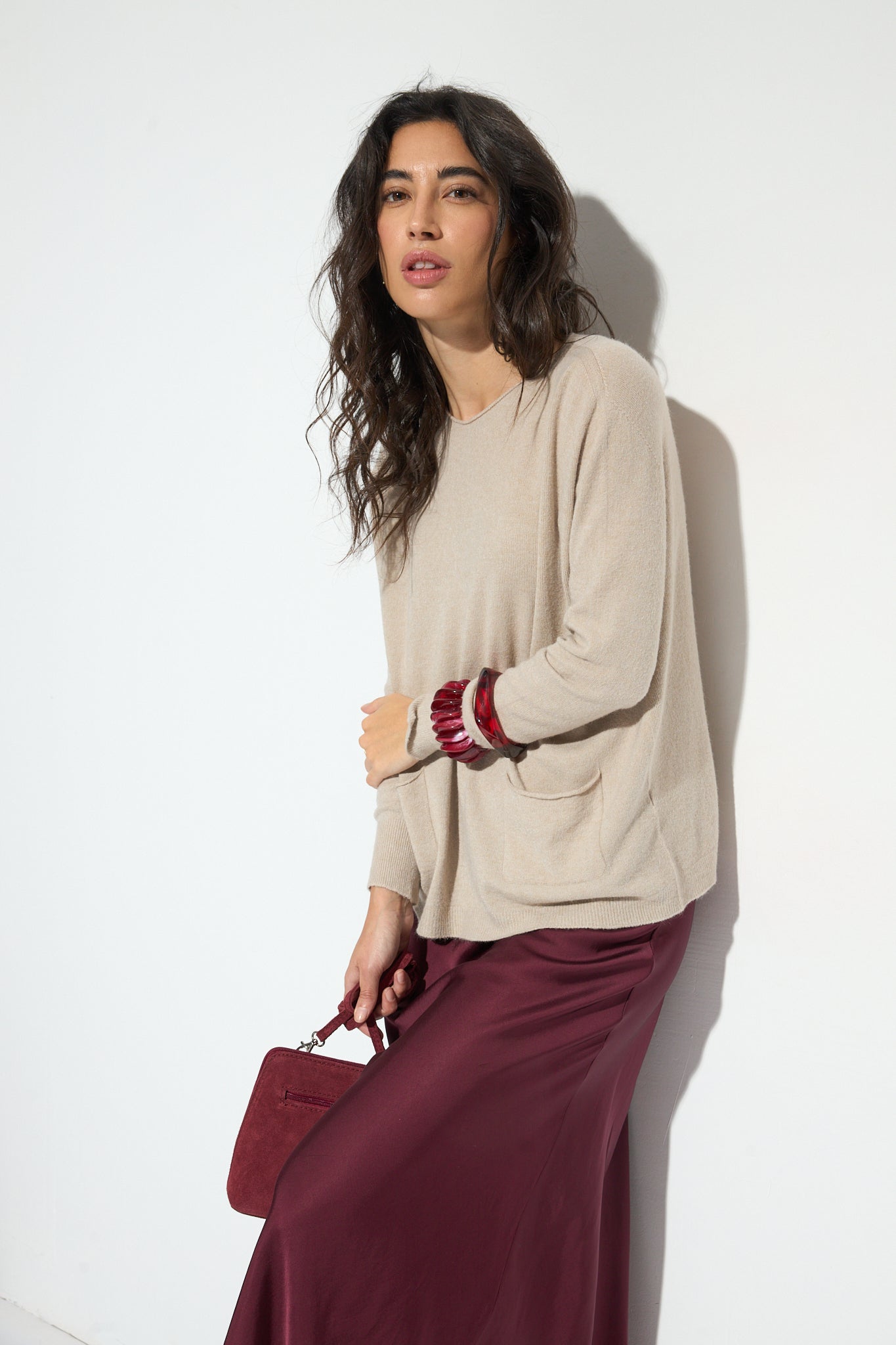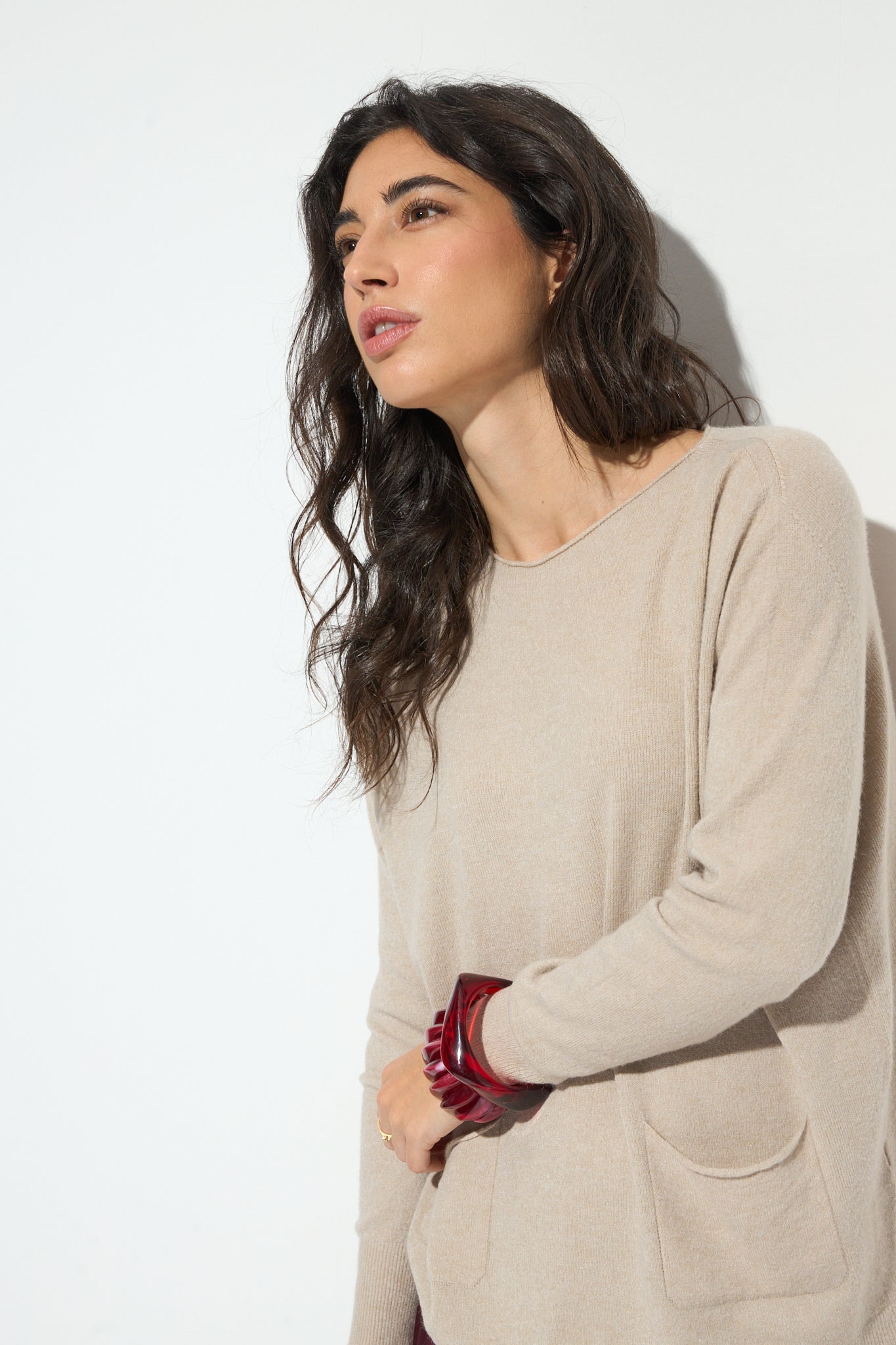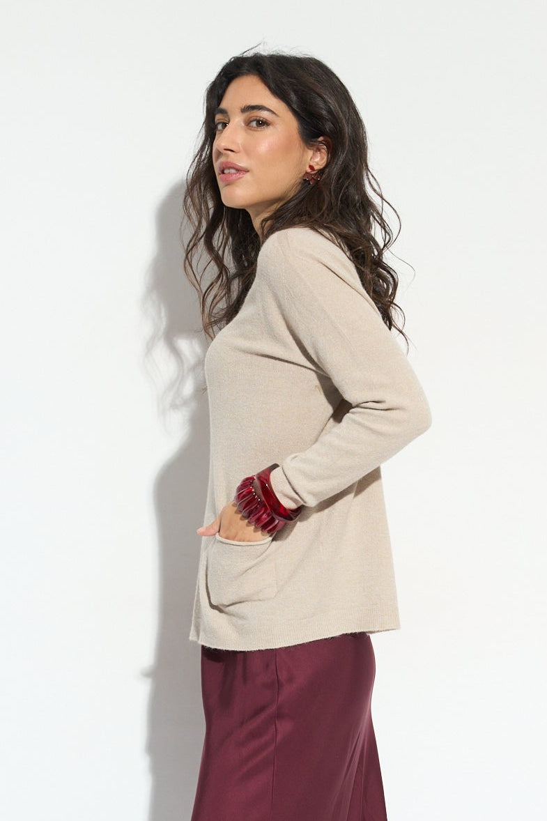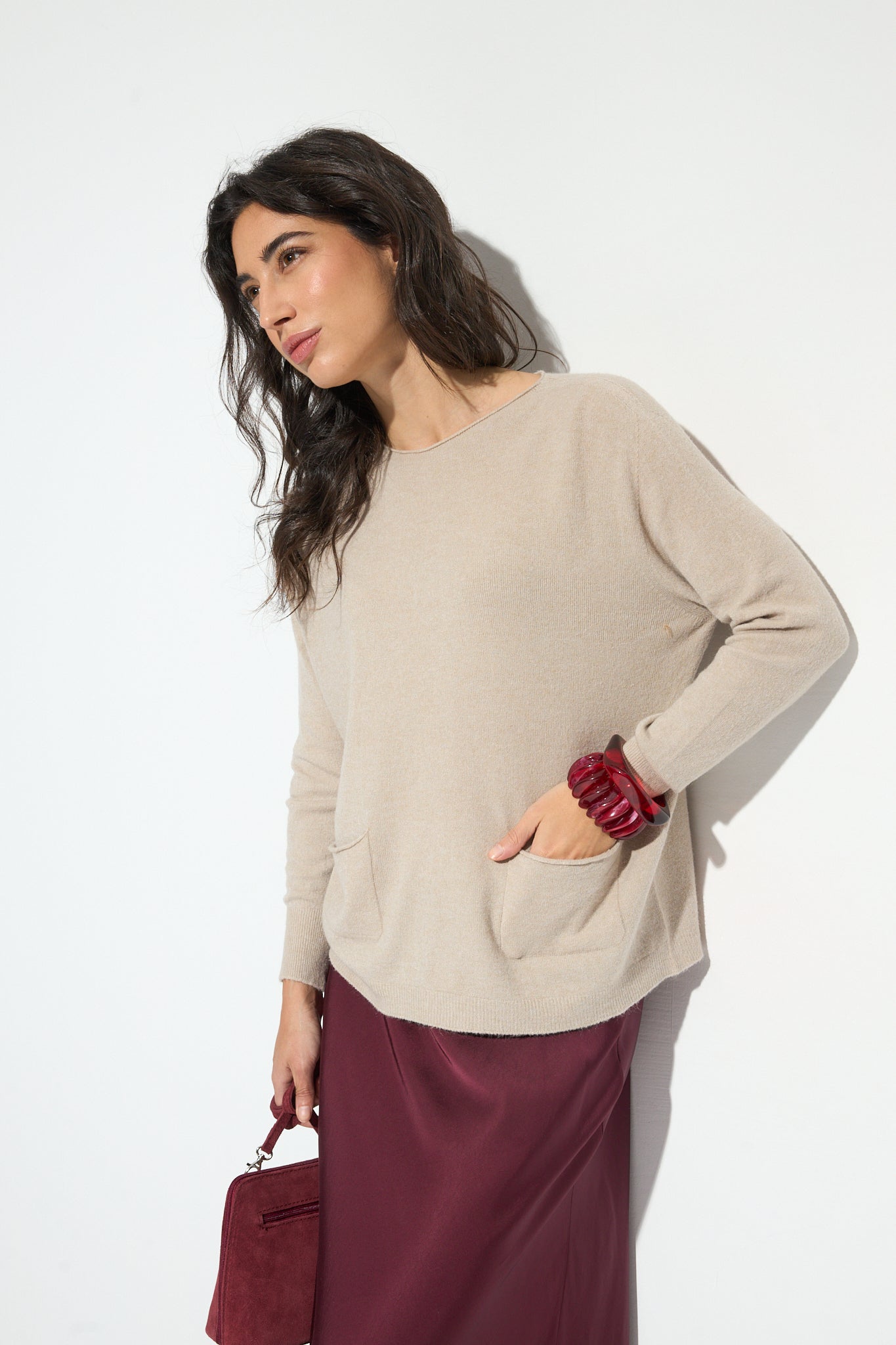Jersey de tejido sin costuras con cuello barco y dos bolsillos en la parte frontal. Una opción sencilla, fácil de combinar y muy especial. ¡Suave, cómodo y con mucho estilo!