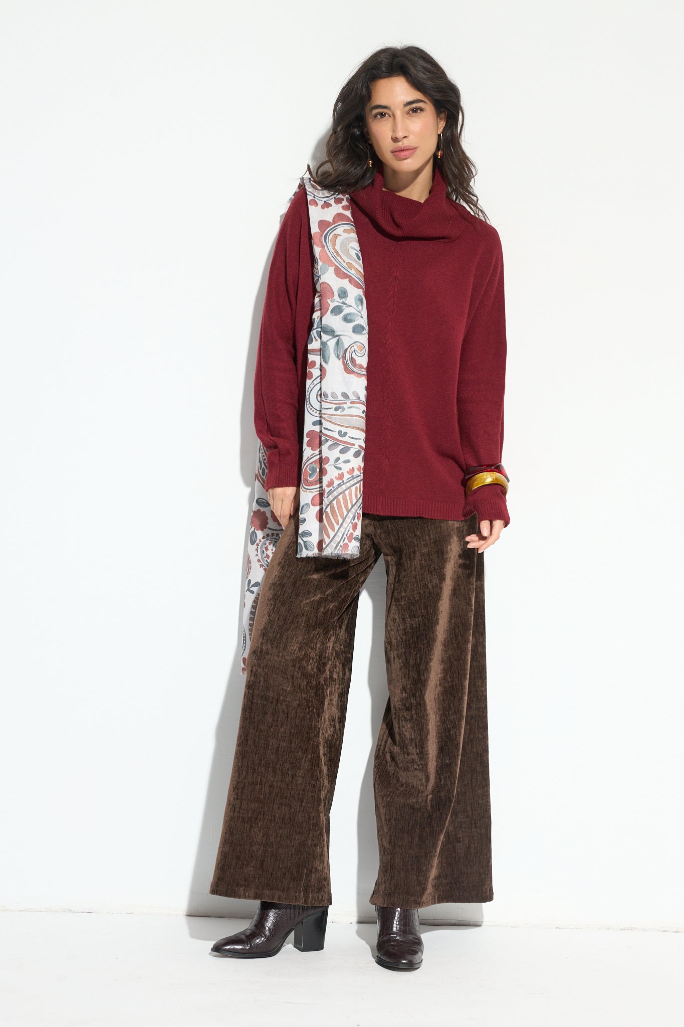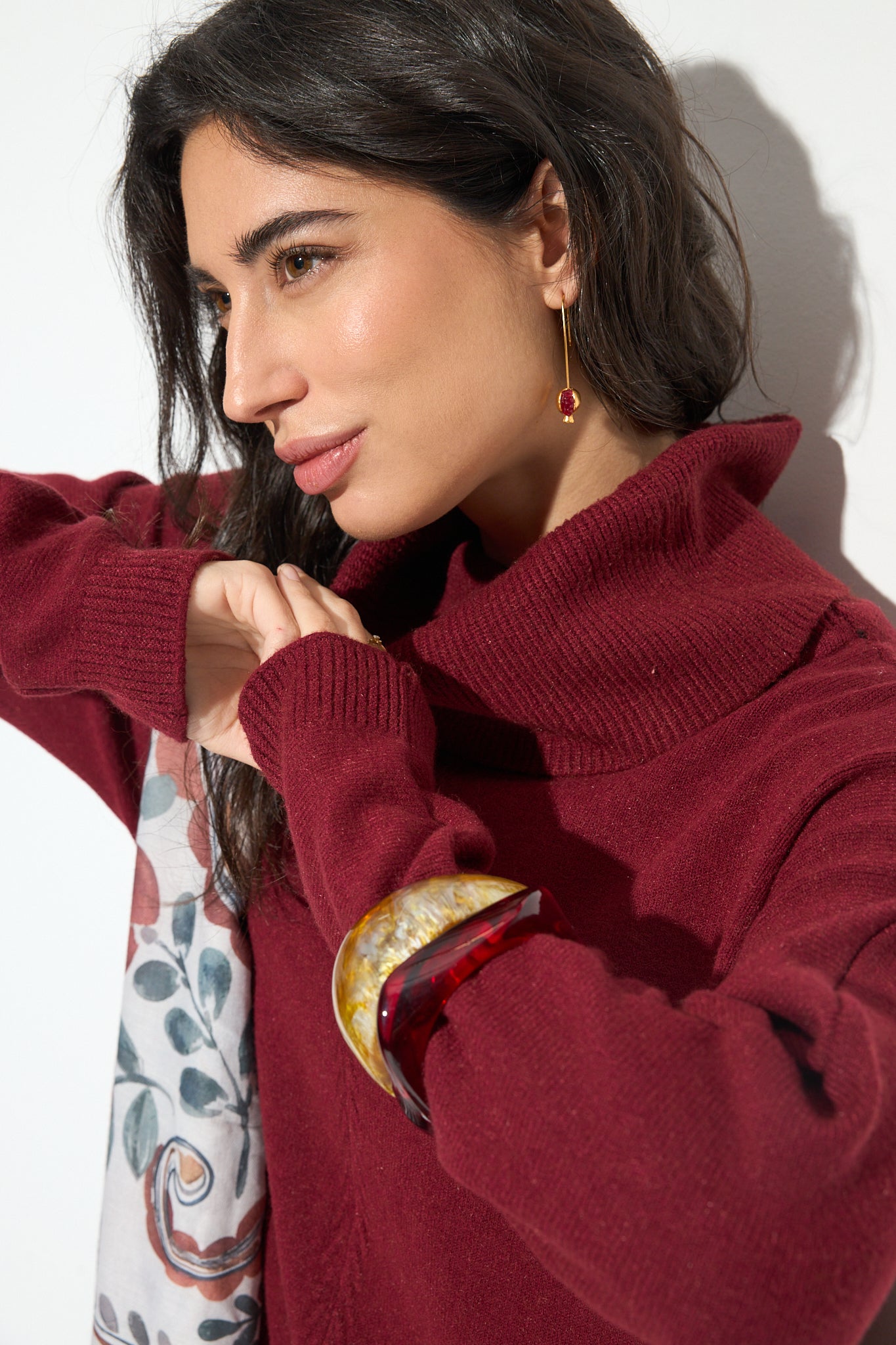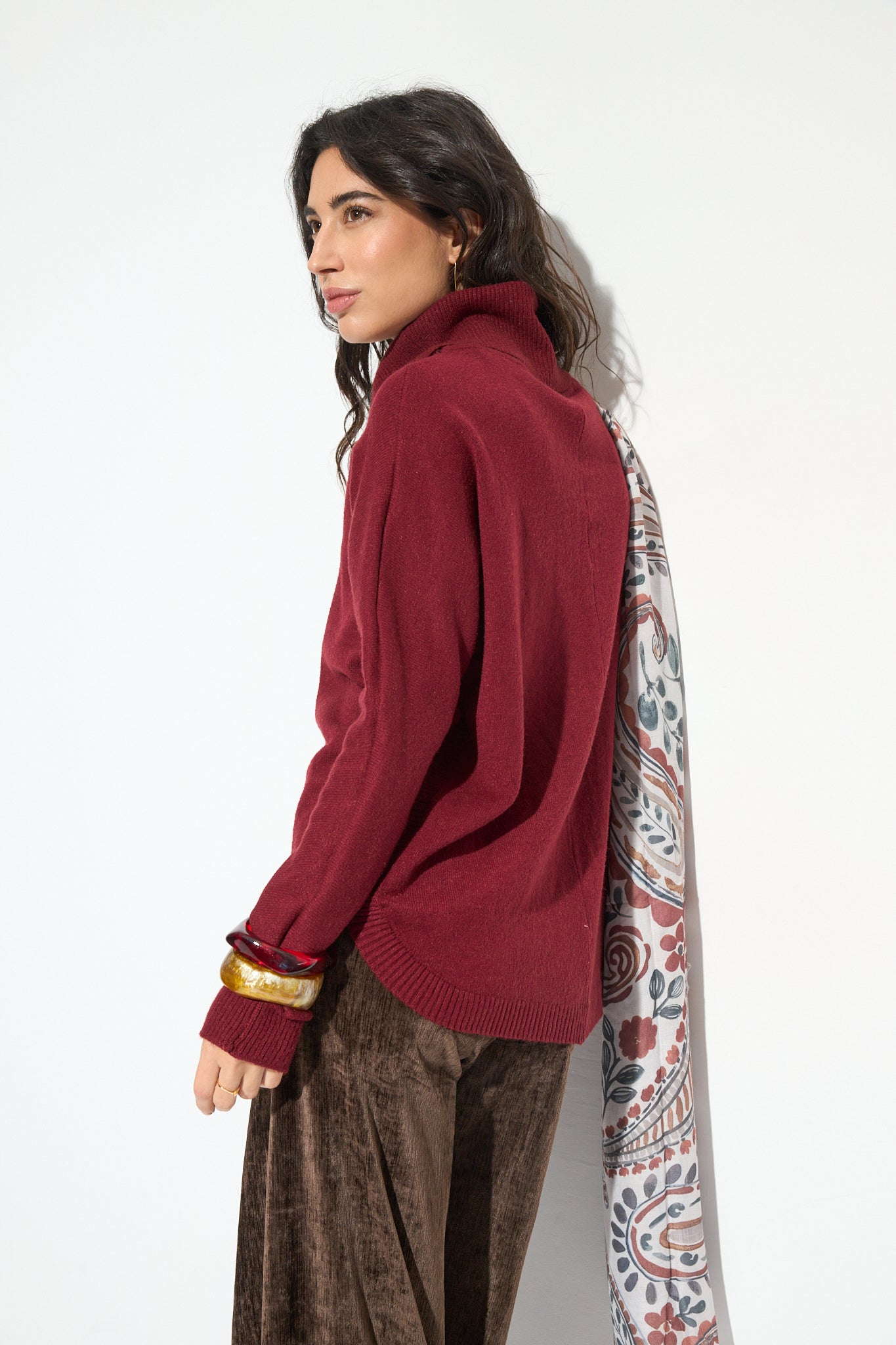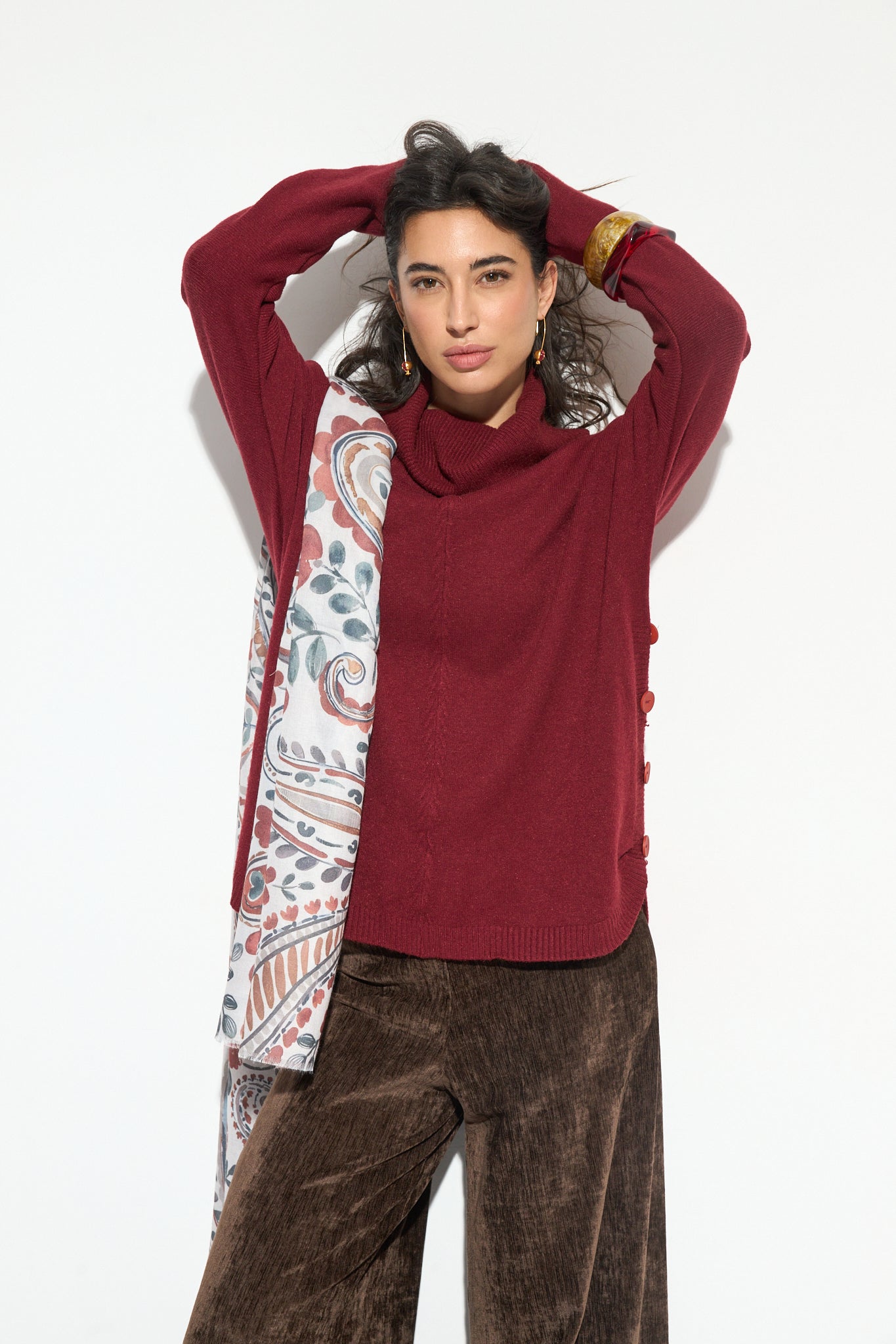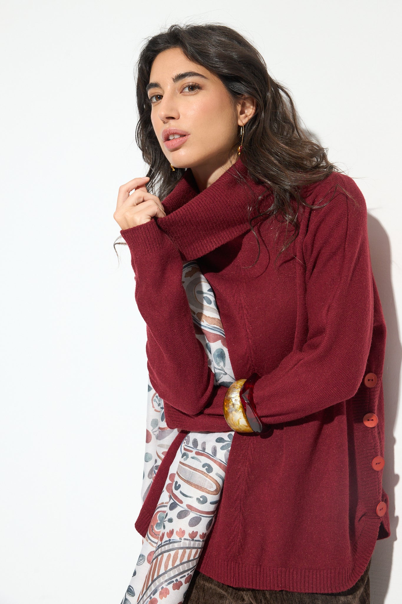 Jersey de cuello vuelto con botones laterales y bajo redondeado y cenefa vertical. Un jersey que nos encanta por cada uno de sus detalles.