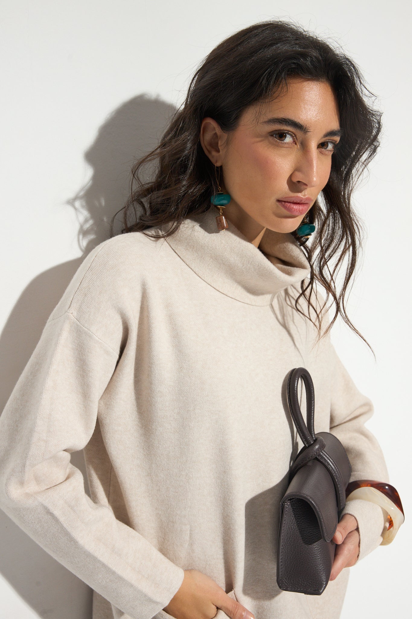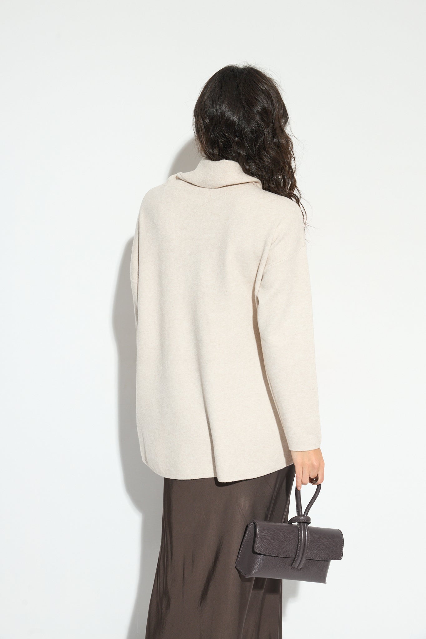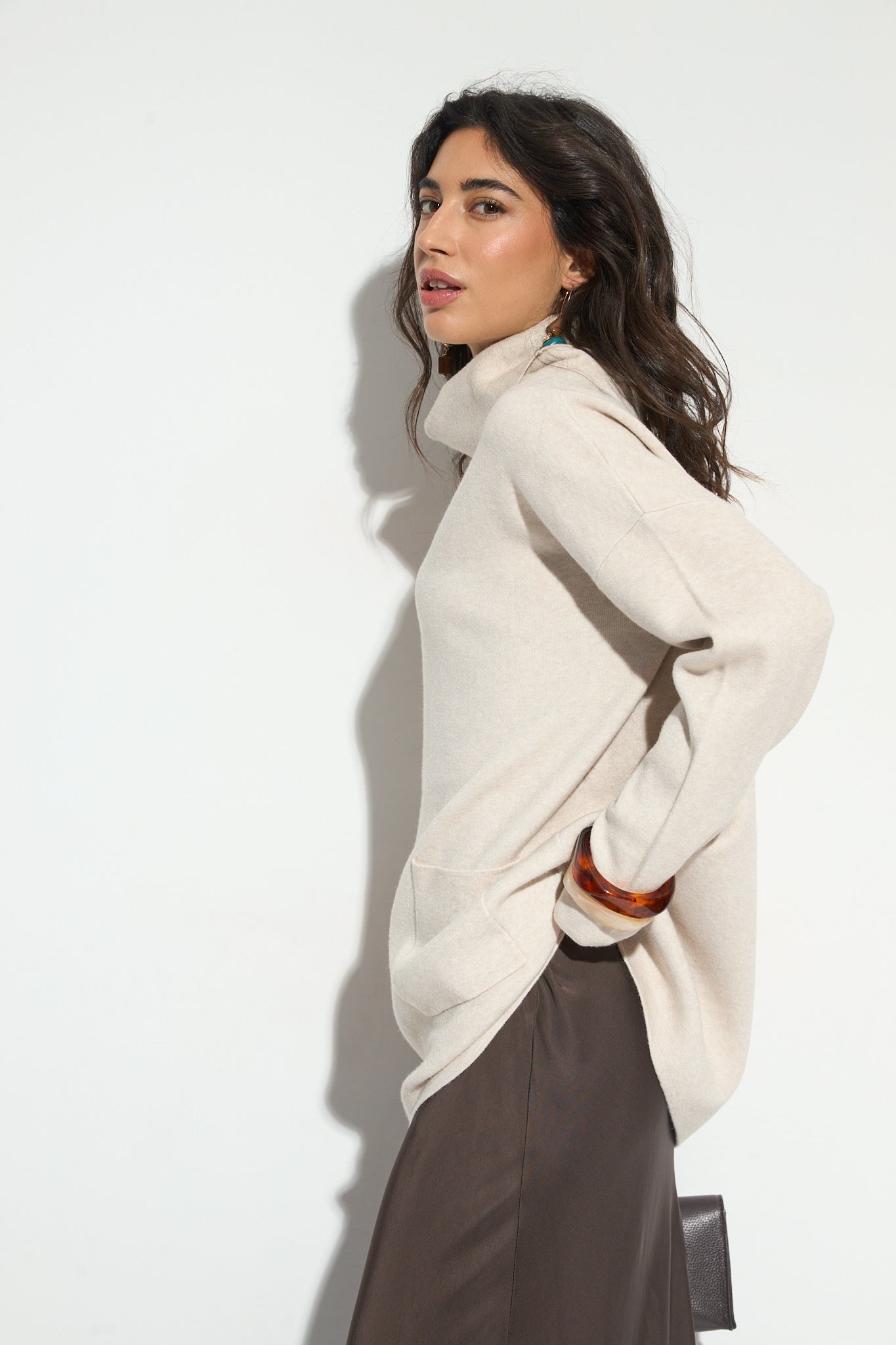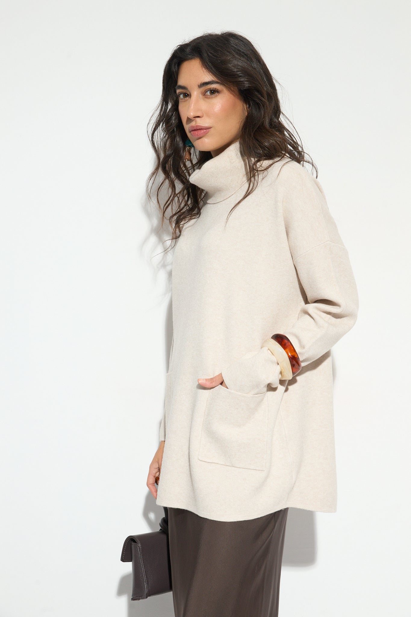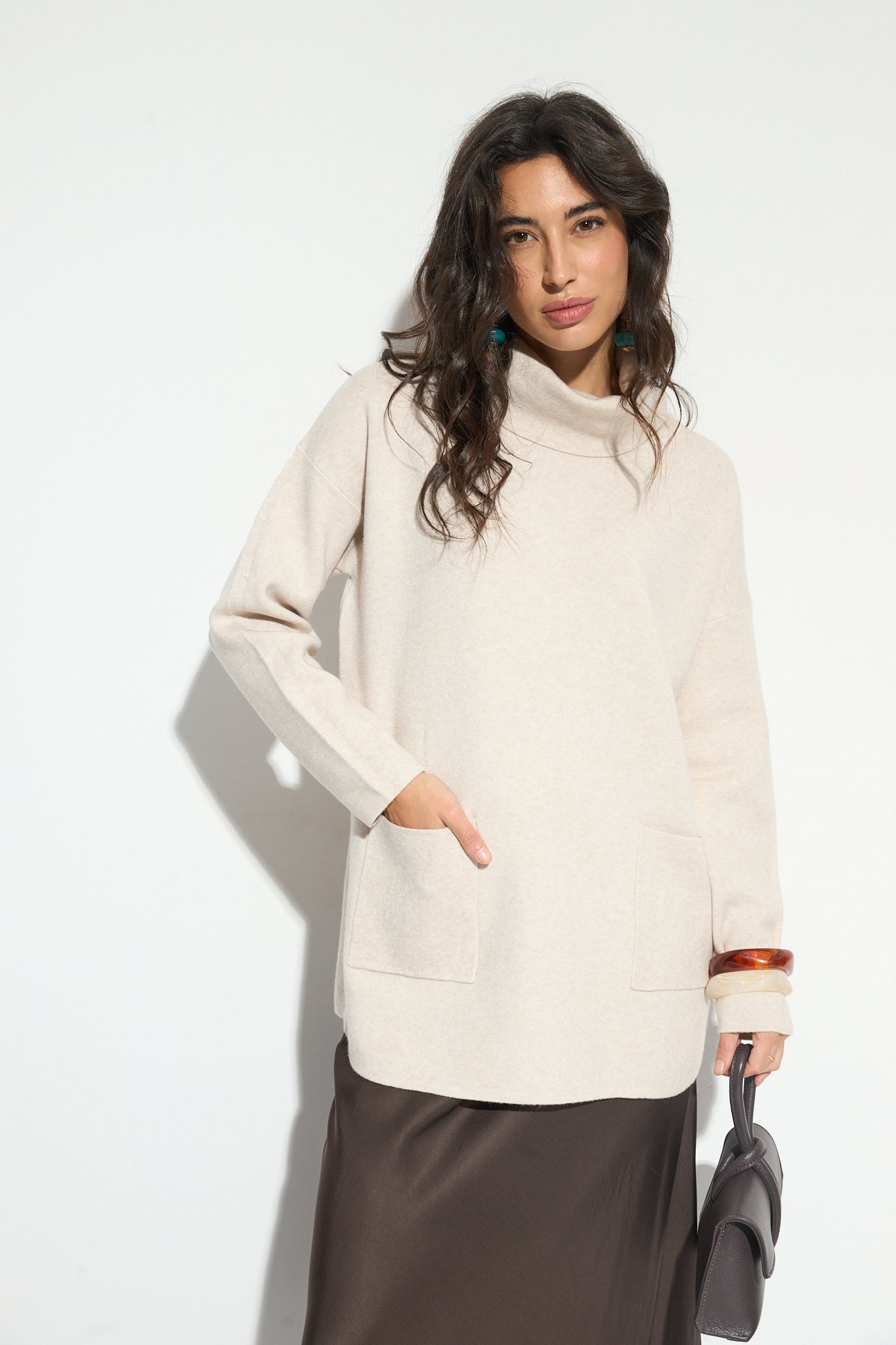 Jersey de cuello vuelto largo y con detalle de dos bolsillos frontales. Un básico, fácil de combinar perfecto para tu armario.