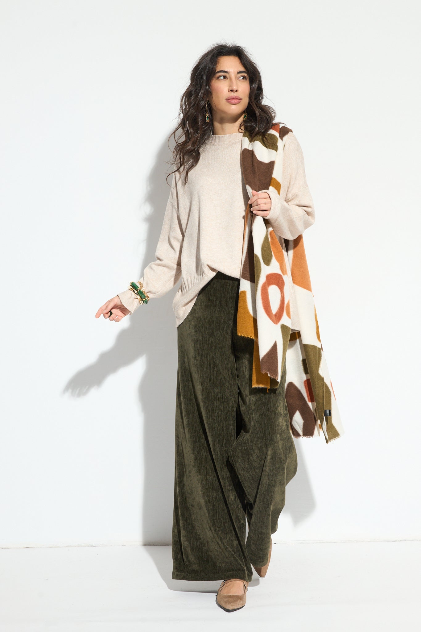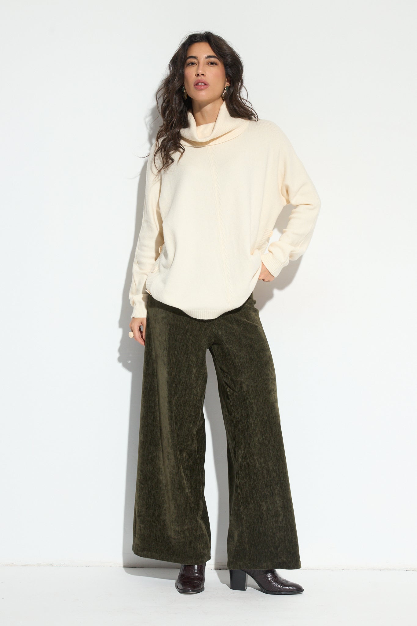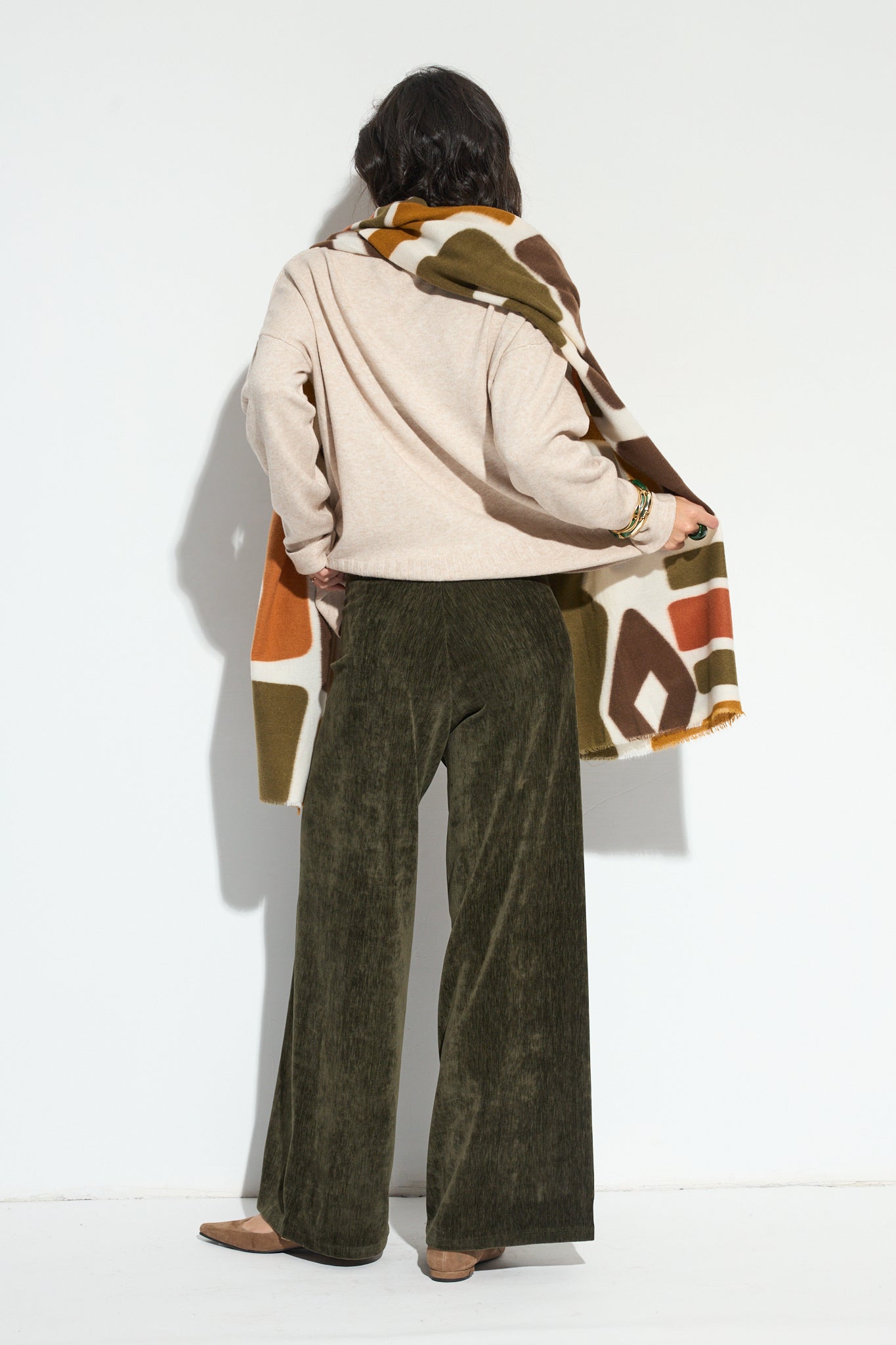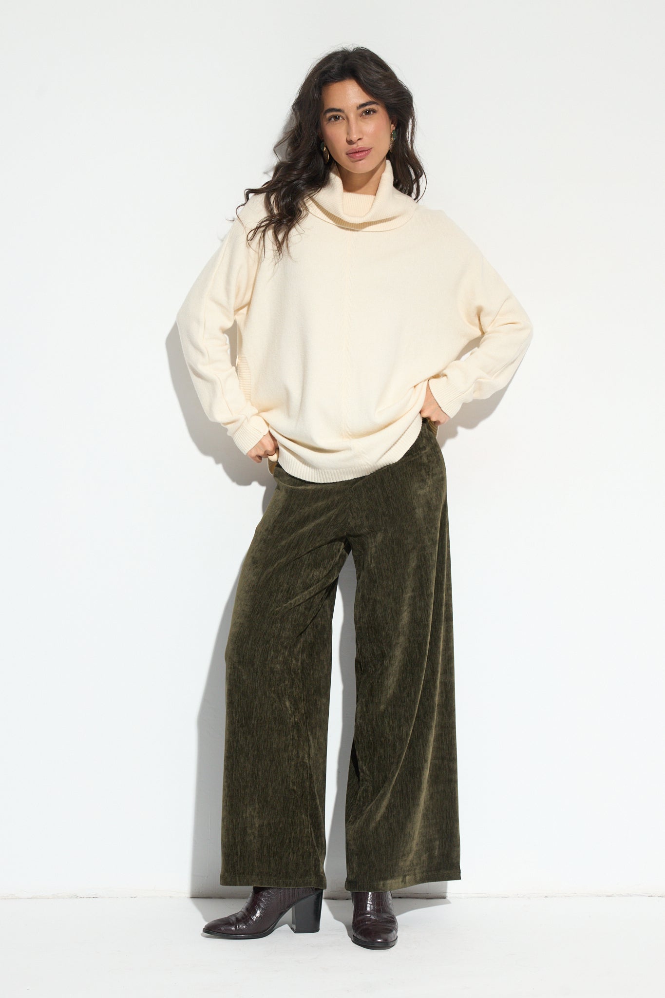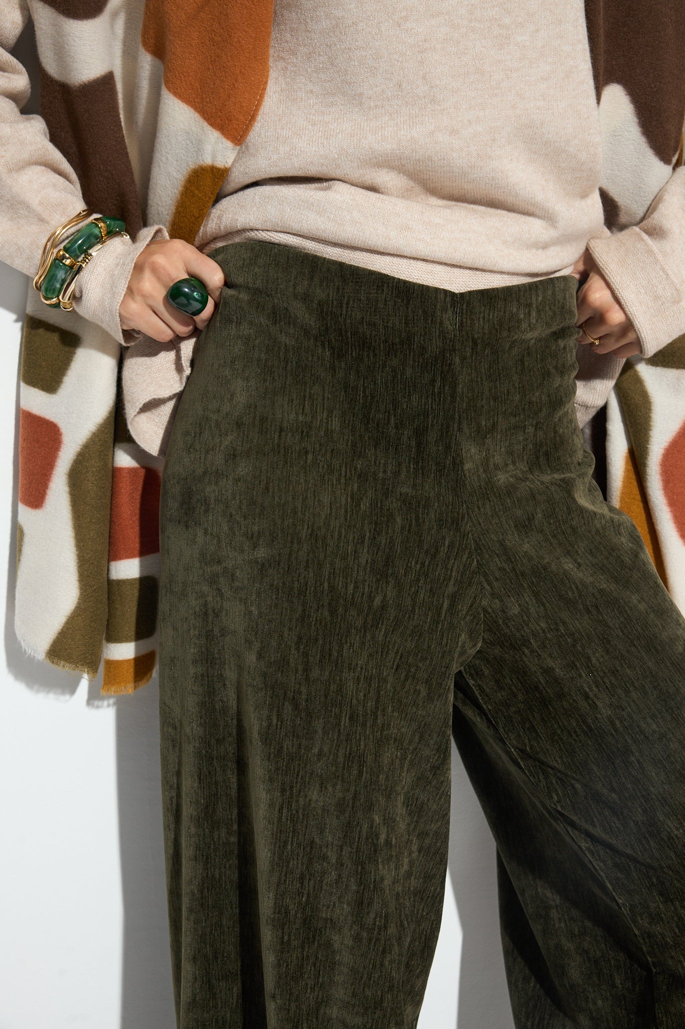 Este pantalón palazzo tipo terciopelo de color verde con goma en la cintura es un fondo de armario que no te querrás quitar.