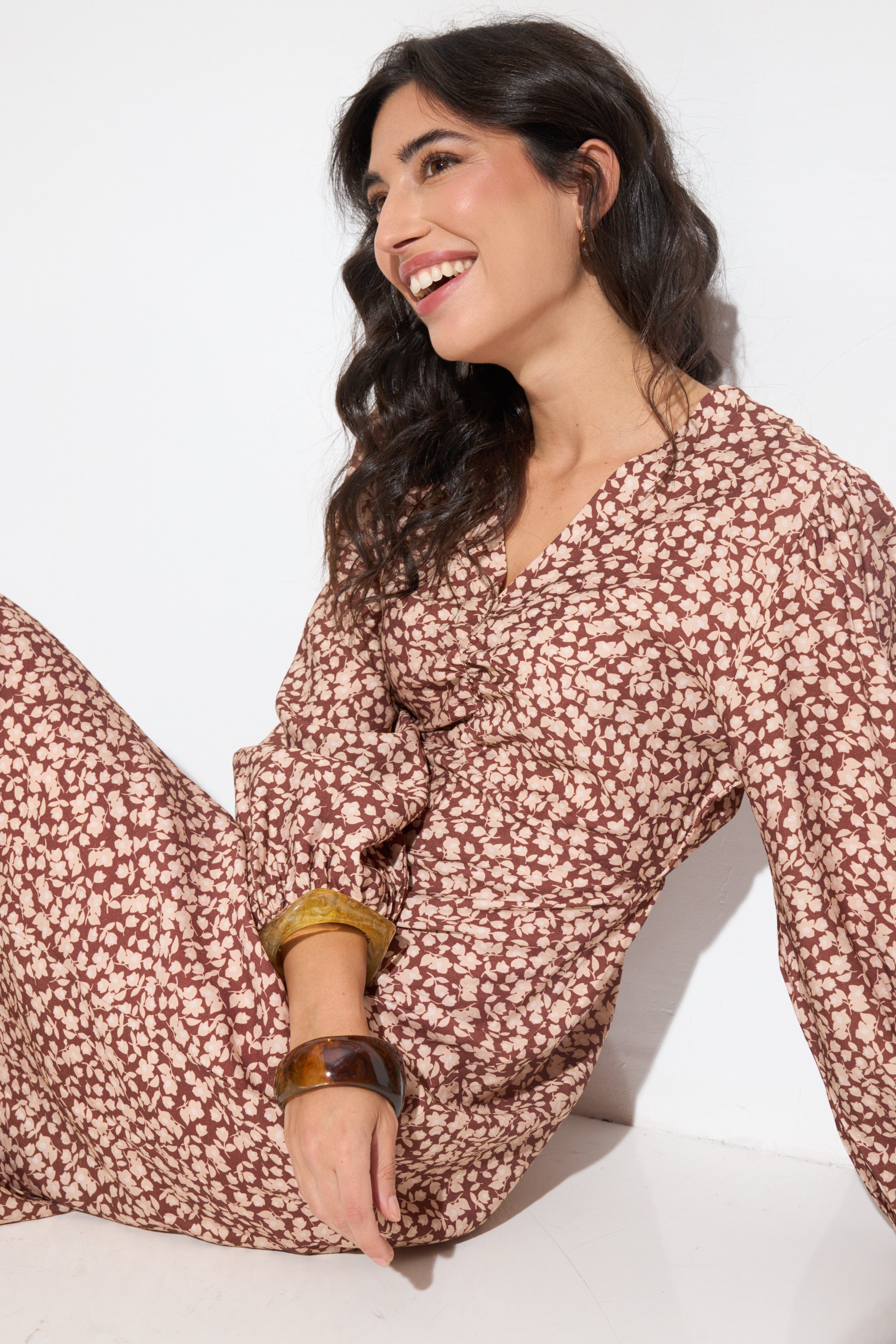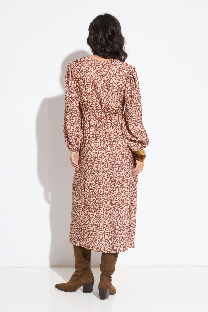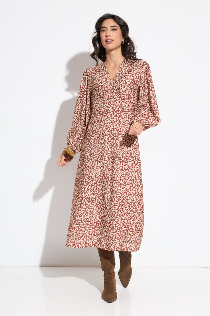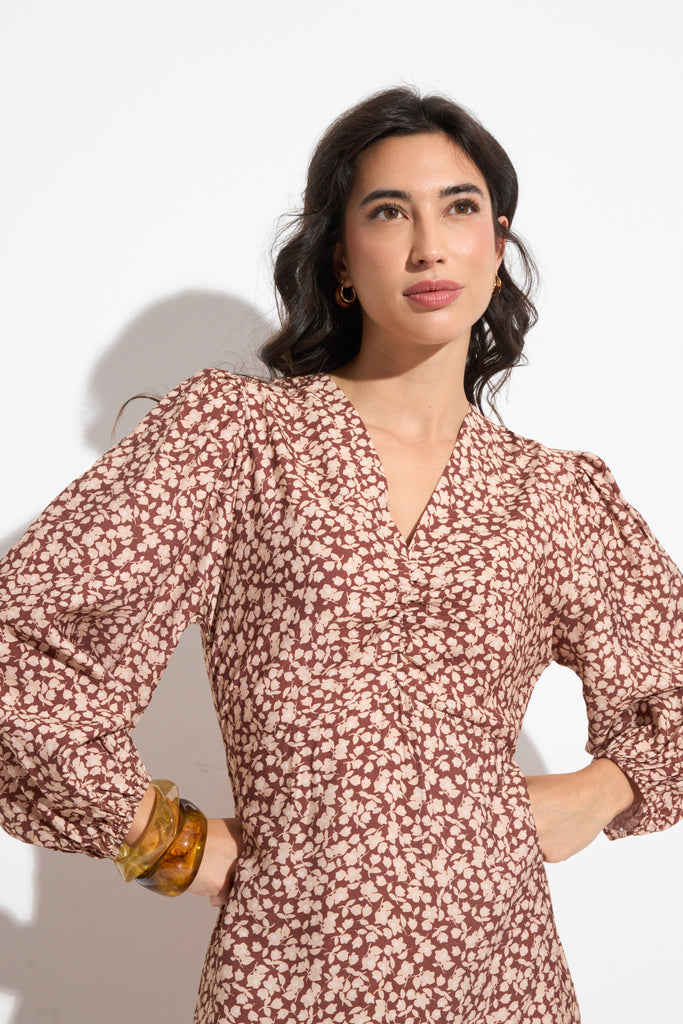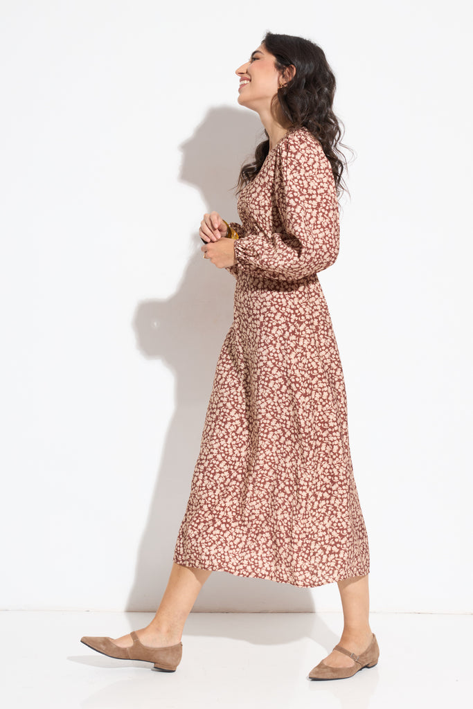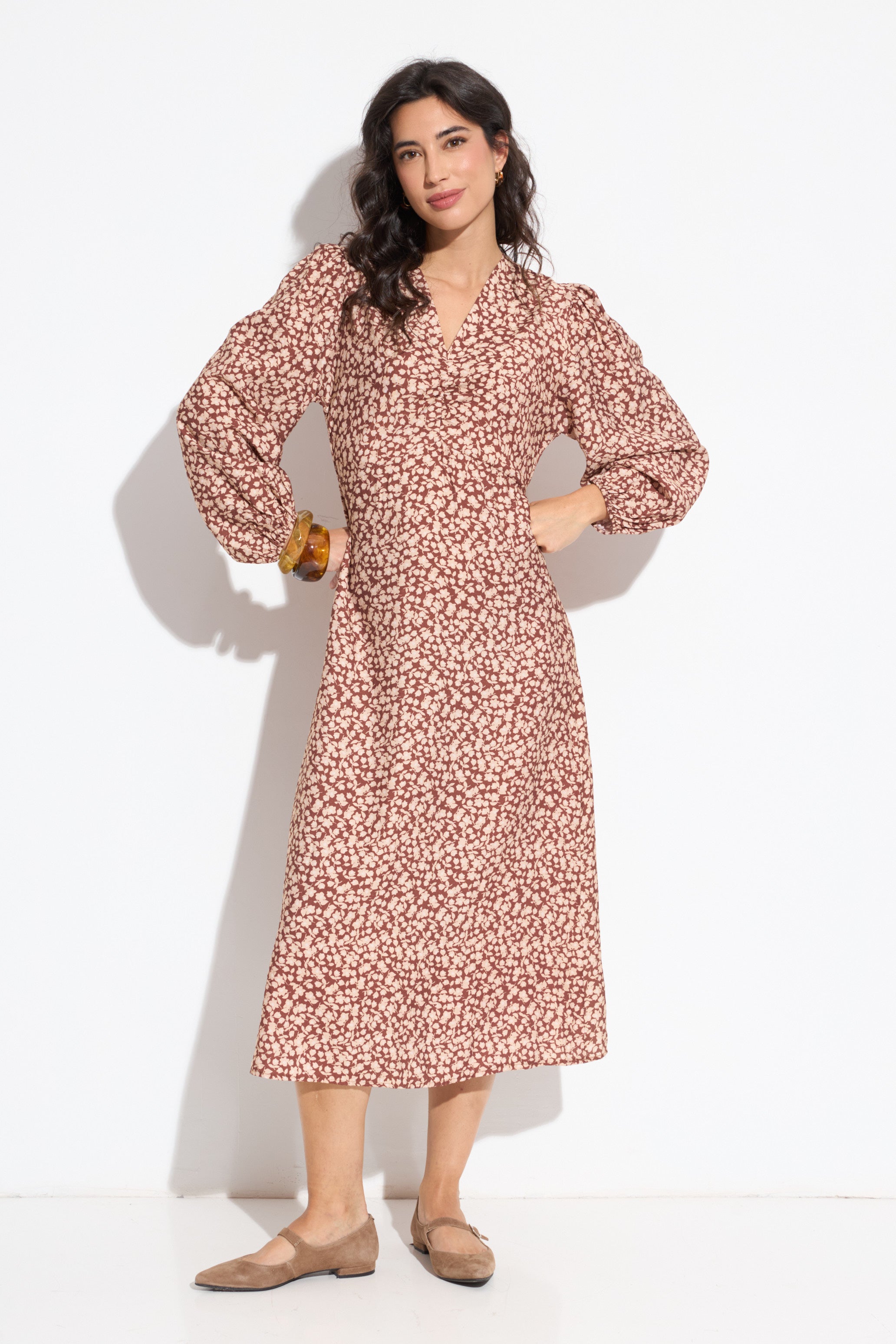 Vestido midi estampado floral de manga larga, cuello pico, pequeño frunce en el escote y goma en la cintura. Una prenda atemporal perfecta para tu fondo de armario.